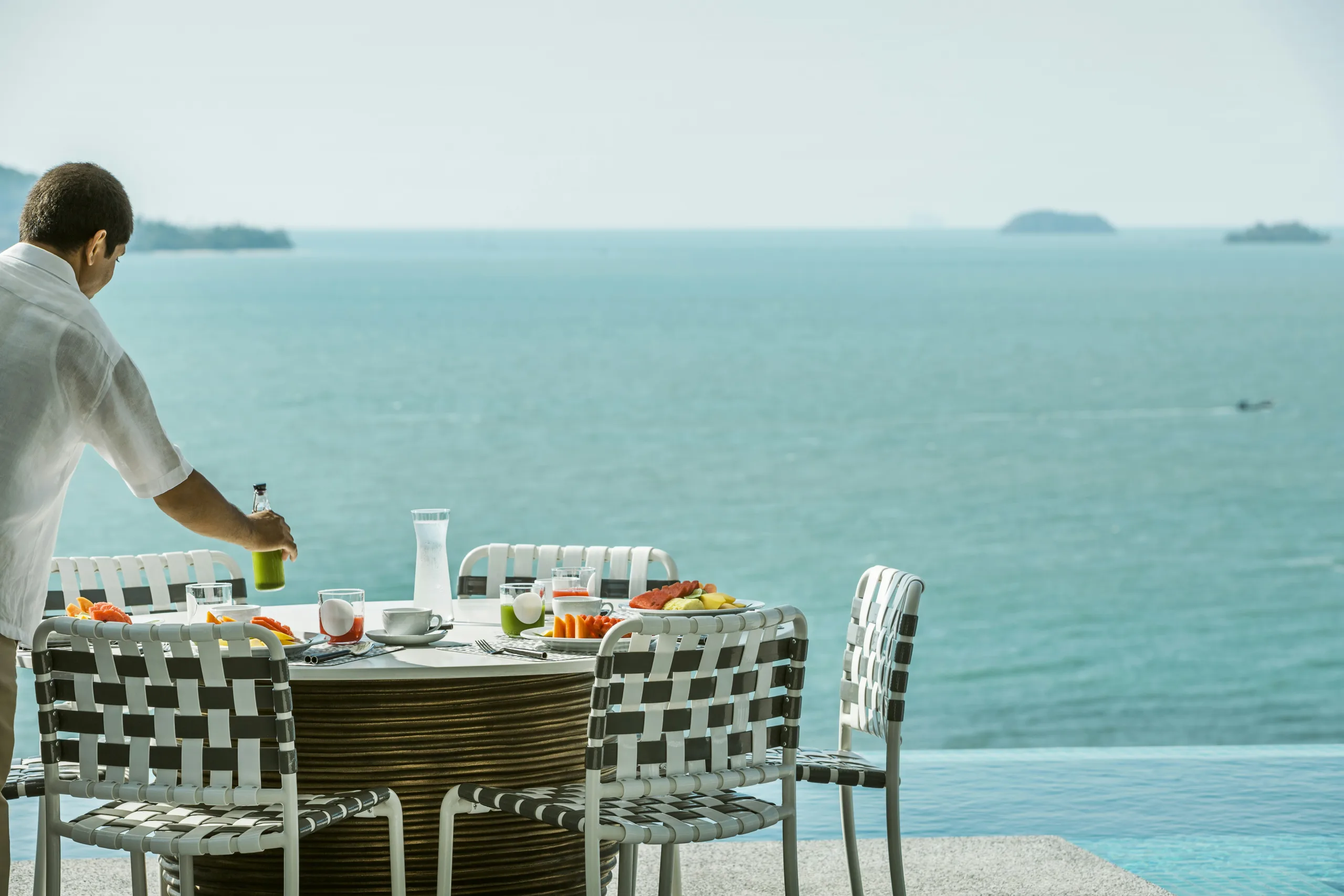 一方、COMO Point Yamu Phuketの立地は、一般的な“ビーチリゾート”とはかなり異なり、静けさと絶景を優先した特別なロケーション。プーケット東海岸の「ヤムー岬」という半島の先端。三方を海に囲まれた高台(崖の上)に建っており、アンダマン海とパンガー湾を見渡すパノラマの絶景が最大の特徴です。周囲には石灰岩の奇岩や無人島が点在し、まるで映画のような幻想的な風景が広がる特別な場所。